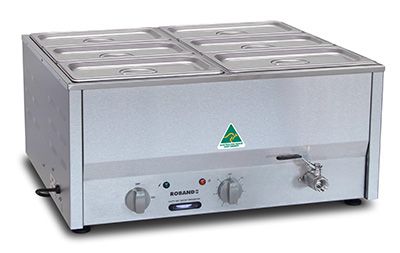 | BM4B | Bain marie, fits six 1/3 size pans, 6 x 1/3 size 100mm pans & lids included | 1,200 Watts | 5.2 Amps | Yes | Yes | 680 x 560 x 320 |