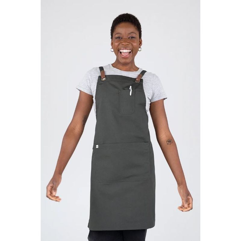LUCA is an ideal chef apron ready for the demands of the kitchen as well as perfect for FOH waiters, baristas, and bartenders. LUCA’s self-fabric, removable cross back straps have a leather look press stud feature that loops through brass-coloured eyelets.