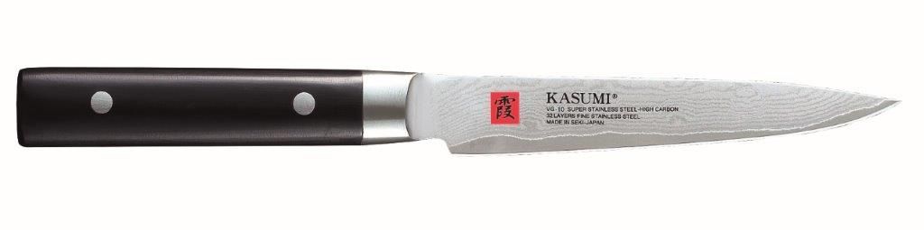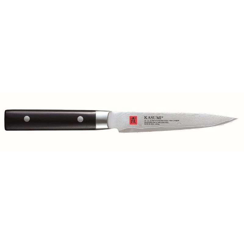 The Kasumi Utility knife is made from VG-10 high carbon Stainless Steel that has been developed especially for knives. The blades are hardened to Rockwell C59-60 degrees, and therefore, keep a sharper cutting edge longer than any other knives.